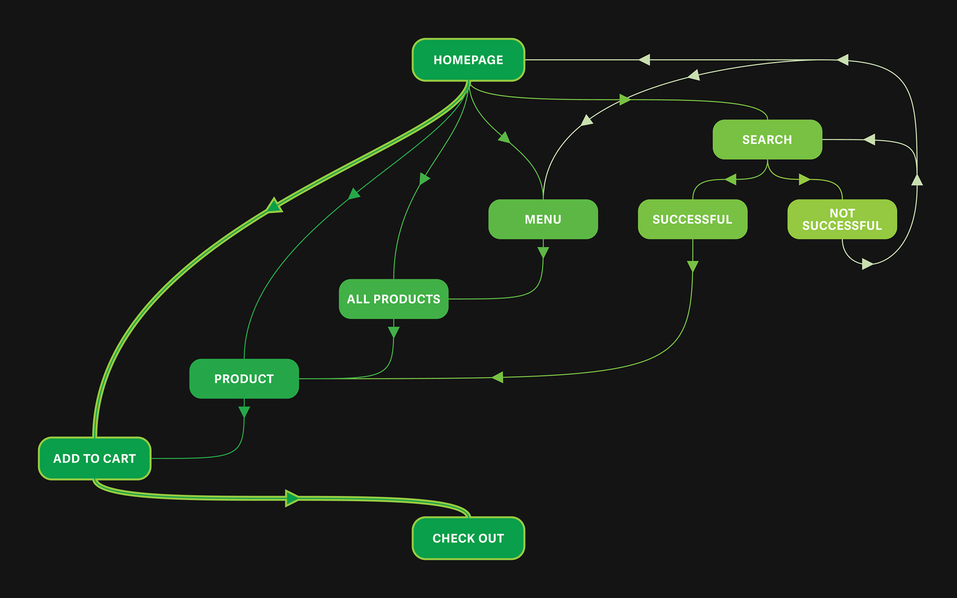 As shown in the user flow below, I created several ways to add a product to your cart from nearly every page on the website. The most efficient way is to add featured products directly from the homepage, but users can also browse through all products or search for something specific.