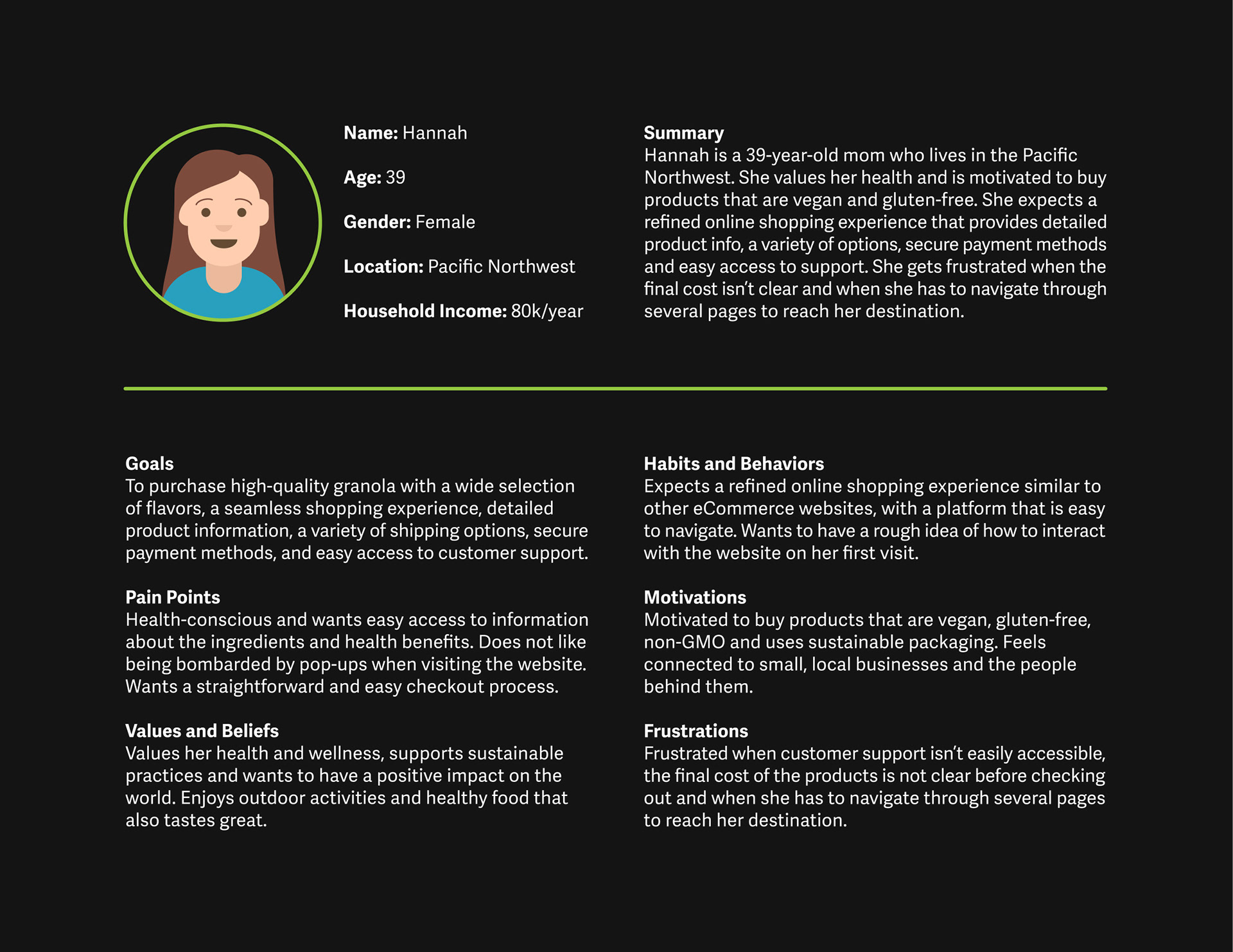 As with every design project, I started this one with research. The goal of my research was to define the wants and needs of Seattle Granola Company's users, identify the objective of the company's e-commerce platform and analyze their current website to best inform my decisions when designing their new one.