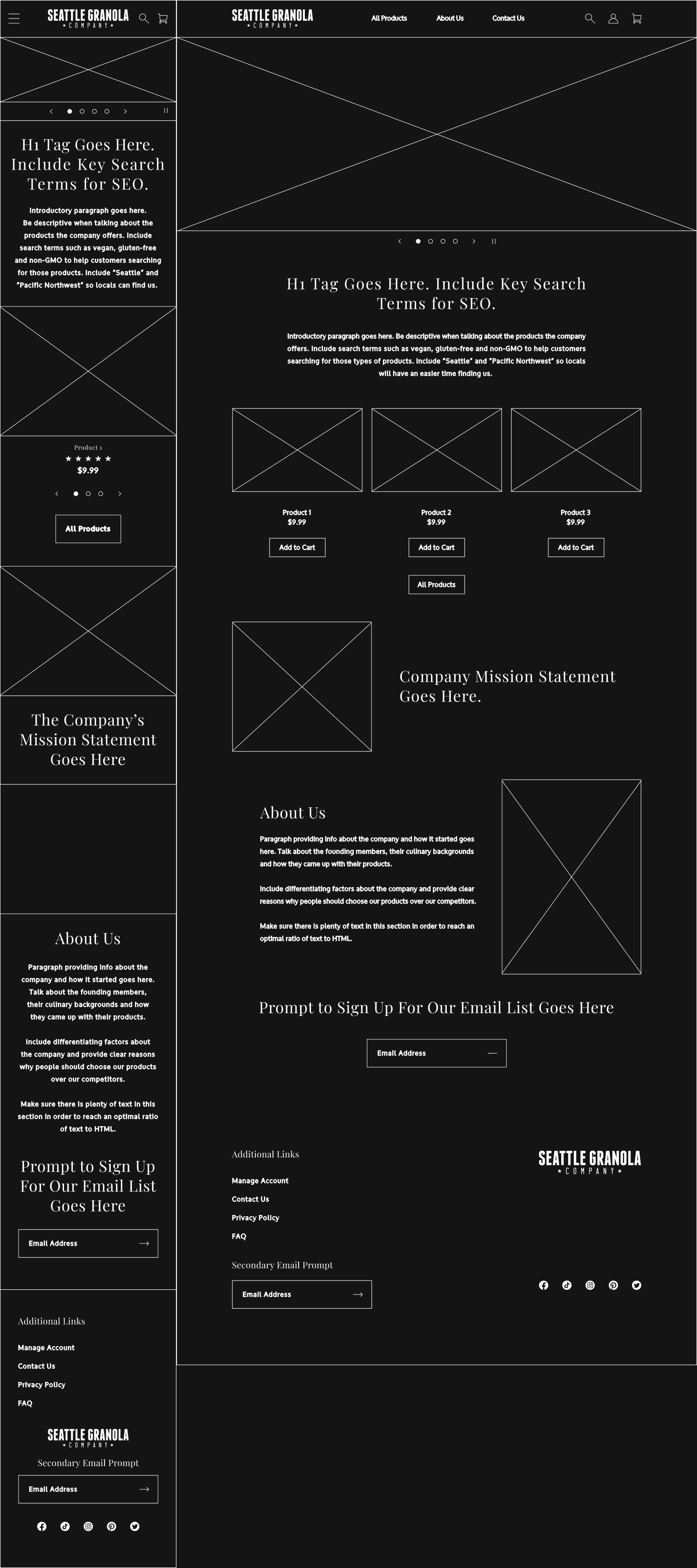 Using the insights gained from my research and my understanding of the Seattle Granola Company brand, I began sketching potential layouts for every page that would meet the needs of our users, as well as the company itself.